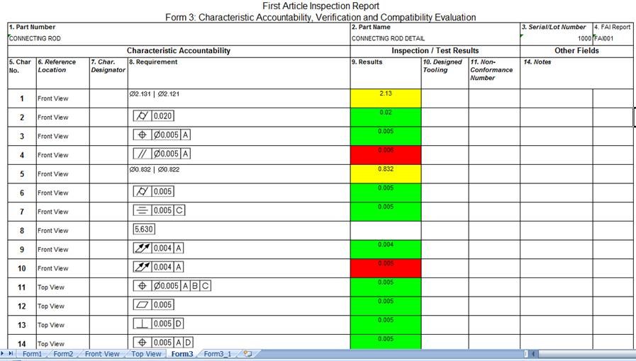 - Form 3 Excel conditional formatting – Upon report generation, users will now find that Form 3 reflects colored conditional formatting based on actual measurements relative to tolerance requirements.