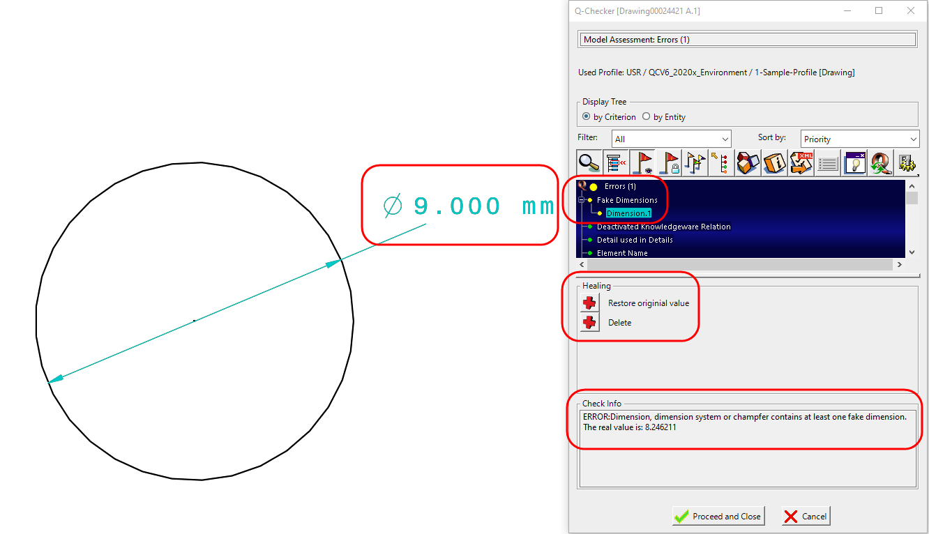 Defining Fake Dimensions in a 2D drawing is a dangerous practice as they do not update to reflect a design change of the 3D geometry. Have you had to update the Fake Dimensions in the drawing when the 3D model changed? Configure Q-Checker to detect Fake Dimension to save potential issues with downstream production that consume the 2D drawing: