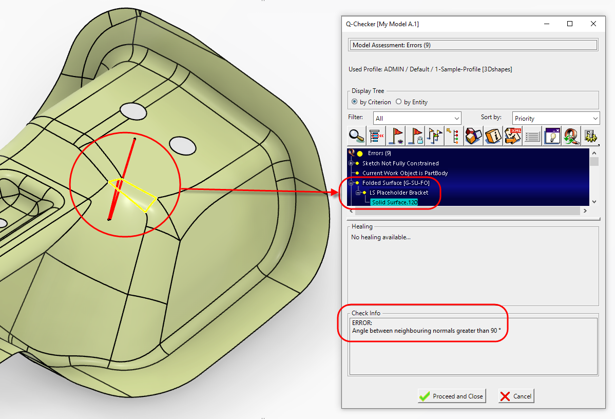 Configure Q-Checker to detect geometric issues such as identifying small gaps, sliver surfaces, folded, or embedded/duplicate surfaces: