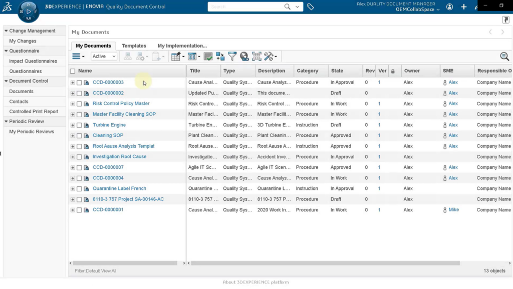 In summary, 3DEXPERIENCE ENOVIA Quality Document Author drives a centralized standard process to manage and release quality documents while ensuring that all concerned parties are trained on new and revised documents. This supports product quality improvements, sets up a foundation for GMP (Good Manufacturing Process), and provides a basis for companies to be CFR and ISO compliant.