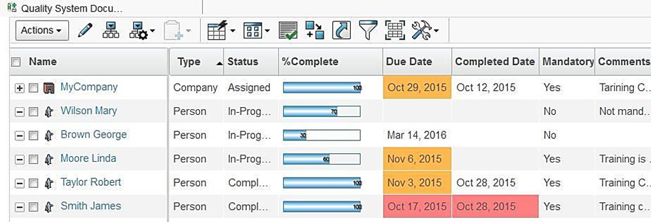 Implementation managers can track training progress of participants for quality documents they are in charge off. In addition to percent completion, 3DEXPERIENCE ENOVIA will also color code the training due dates of participants so that managers can ensure on-time completion of training.