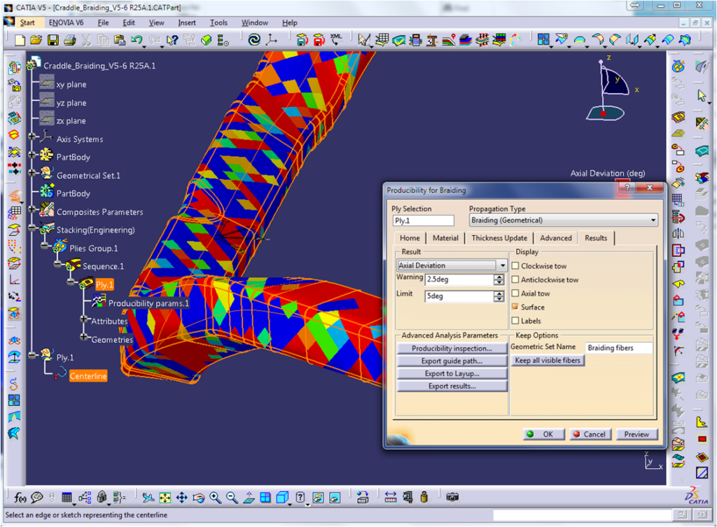 - CATIA braiding application provides an advanced braiding fiber simulation to allow designers to visualize fiber paths on complex surfaces and optimize machine parameters to achieve desired fiber orientations.