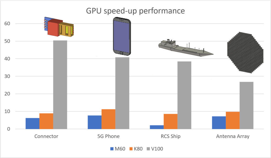 GPU speed-up performance compared to Intel Xeon E2676 using CST Studio Suite 2020: