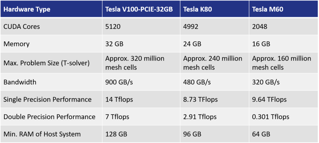 As a general rule of thumb, one can solve approximately 10 million mesh cells for each GB of GPU RAM when using the time domain solver. The memory capacity of the GPU therefore determines the size of the problem one can solve. This means doubling the number of GPU cards, one can solve an electromagnetic problem that’s double in size. Another important aspect of the GPU specification is the bandwidth. The memory bandwidth is a measure of the data transfer speed. High memory bandwidth together with the high number of processing units gives it the ability to offer significant speed-up for electromagnetic simulation.