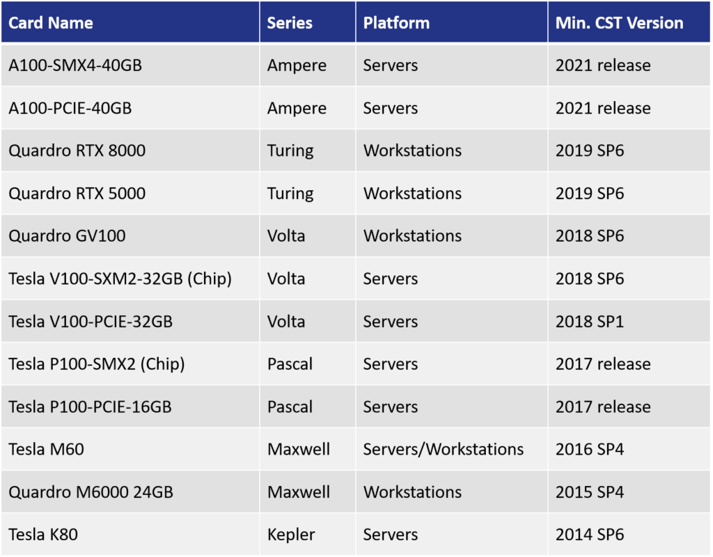 As new GPUs come to market every year, CST Studio Suite updates the supported devices regularly, with each major release and with subsequent service packs. In CST Studio Suite 2021, the NVIDIA® A100 cards are supported. For the complete list of supported GPU devices, please refer to the GPU Computing Guide 2021.