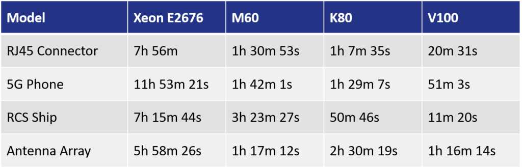 Different cards offer different performance enhancements. The most powerful Nvidia HPC card available now is the A100, which is only for server machines since the card itself does not offer active cooling. Workstation users can choose the Quadro GV100 because of the built-in active cooling fan. The chart below shows the simulation run time improvement for selected GPUs on various models using the Intel Xeon E2676 performance as a baseline. The solver loop time was used in this comparison for the RJ45 connector, 5G phone and Antenna array because it is a better benchmark number to use for the GPUs.