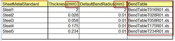 The Bend Deduction Tables are a series of Excel files defining allowable values and value ranges for things like Thickness, Default Bend Radius, the types of Stamps allowed, and the BendTable which manages deduction values. If you wish to use Bend Deduction values, you need to define a BendTable column, directly after the DefaultBendRadius column. Each BendTable is to be a separately defined Excel file and you need to point to it from the master Sheetmetal Standards Excel file. Such as: