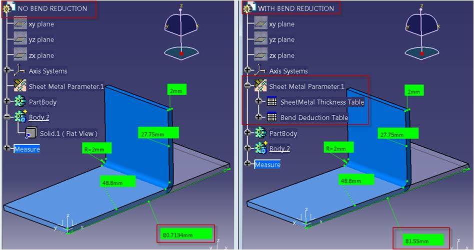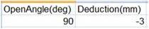 If you have more than one value defined in the table, according to the open angle the bend deduction will be read in the Deduction column or interpolated between values. You can define as many angle ranges and deduction values that you need, as long as they are listed in order from smallest to largest, because this is how CATIA determines the ranges and interpolates the deduction between the explicitly defined angle values (Zero is implied). For any angle greater than listed, the last deduction value is used.
