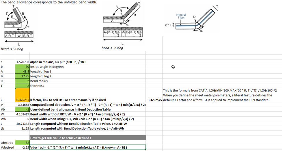So how do you find a meaningful BDT value if you want to hit a desired L (flat length)? Rearrange the formulas to solve for V. I’ve done this in the spreadsheet below. The purpose of this particular spreadsheet is to allow you to enter the desired flat pattern length and return the value you should use in the BDT to achieve it (based on known values for A, B, angle in degrees, thickness, bend radius).